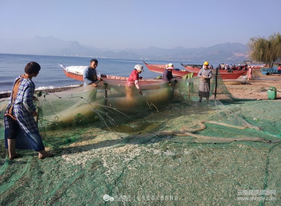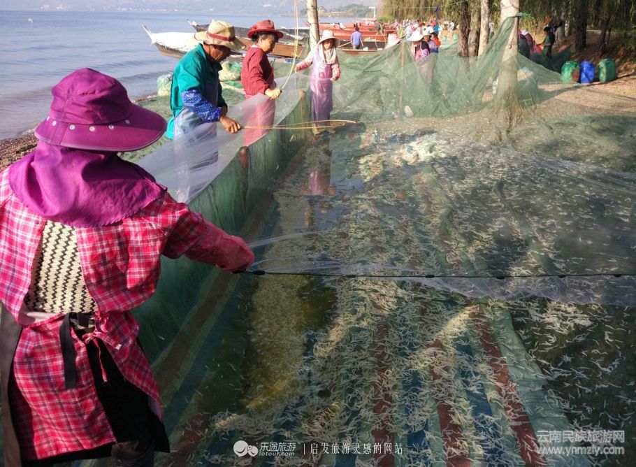 如果沒有更多奇妙的事也就枉為撫仙湖,知道了鱇蒗魚的捕魚方式還不算了解高原明珠,只有了解了撫仙湖銀魚是如何從浩瀚的湖水里來到餐桌上,才算一飽眼福,銀魚因為超凡的適應性和繁殖能力在撫仙湖是可以定期捕撈的,夜晚漁民將網(wǎng)撒在湖里,開啟燈光誘捕銀魚,早晨開始起網(wǎng),看漁民們手持魚拍不斷地擊打漁網(wǎng),小小的銀魚上下紛飛,最終落下來,越積越多,男男女女在勞作中猶如從事藝術(shù)表演,有韻律,有意境,有歡樂,撫仙湖畔的銀魚捕撈就是一幅風情畫。