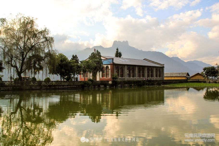 老姆登教堂,怒江流域最大的基督教堂,青磚墻,紅漆木窗,白鐵皮屋頂,簡單樸素,紅色十字架直指天空,“神愛世人”,字體鮮艷。