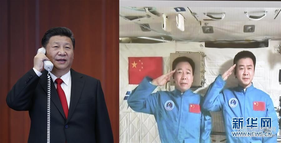 16時25分,景海鵬、陳冬到視頻通話位置并排站立,向習近平敬禮。習近平微笑著向2位航天員點頭致意,拿起電話機同航天員通話。親切的聲音通過電波傳向地球上空約380公里高度的天宮二號與神舟十一號組合體。