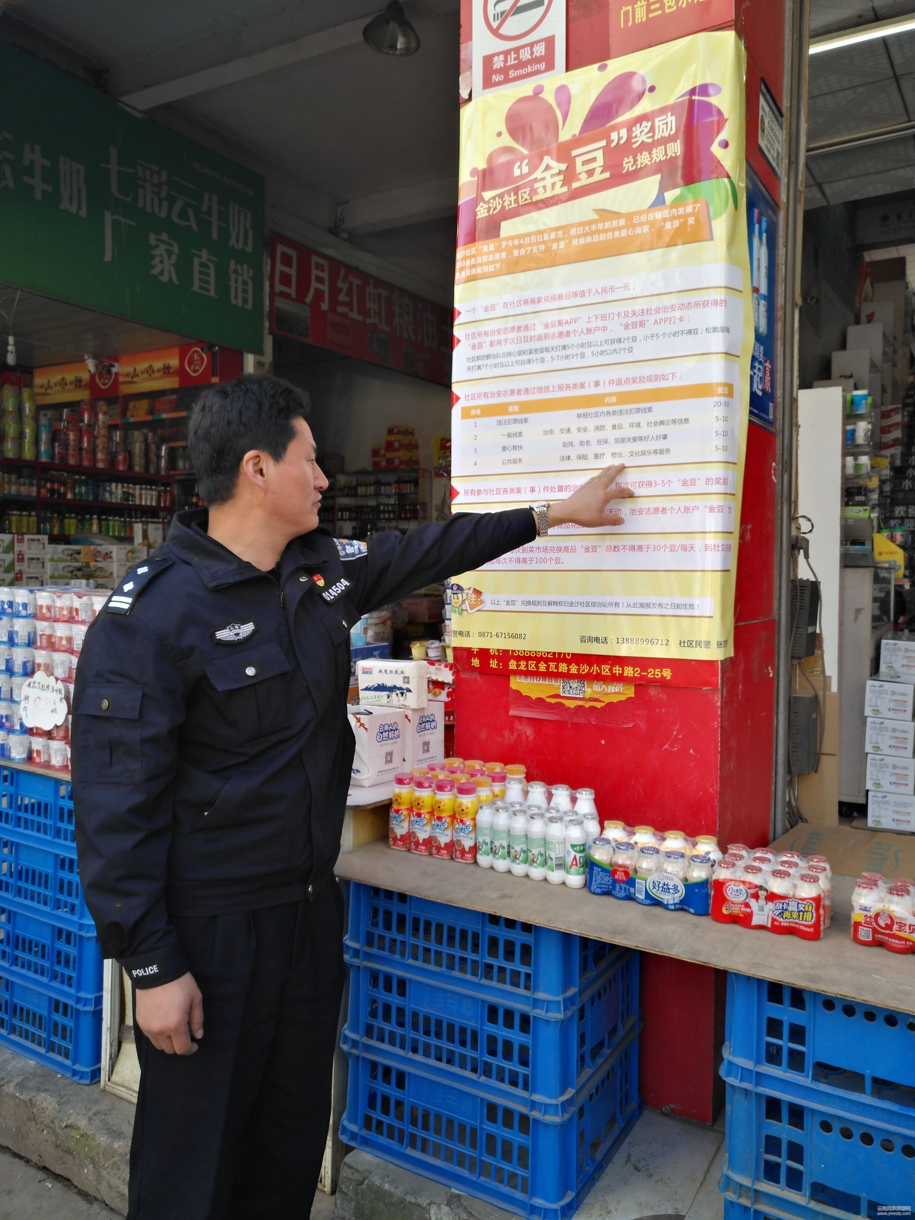 12月9日一大早,在金沙社區(qū)的金沙農(nóng)貿(mào)市場(chǎng)門(mén)前,很多買(mǎi)菜的群眾和賣(mài)菜的攤販都聚攏在一張《金沙社區(qū)“金豆”獎(jiǎng)勵(lì)和兌換規(guī)則》前,饒有興趣地觀(guān)看著,工作人員在為商戶(hù)兌換“金豆”。“‘金豆’是啥?咋還能用來(lái)買(mǎi)東西……”不少群眾圍著昆明市公安局盤(pán)龍分局金沙派出所社區(qū)民警張志明爭(zhēng)相詢(xún)問(wèn)著。
