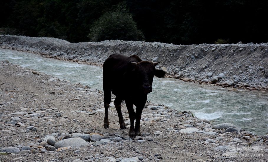 返程的時候,幸運的遇到了獨龍牛,野生的獨龍牛具有攻擊性,而這頭是半野生的,所以當(dāng)我們走過它身旁的時候,它只是呆萌的看著我們。