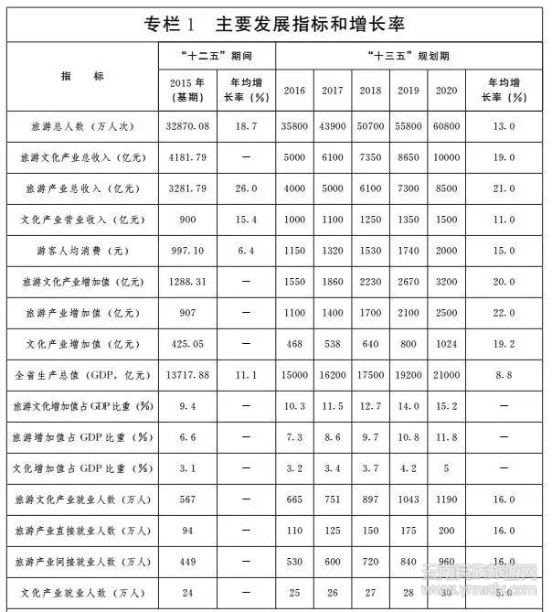 到2020年,力爭全省接待旅游總?cè)藬?shù)突破6億人次,旅游文化總收入突破1萬億元,年均分別增長13%和19%;游客人均消費水平提高到2000元以上;旅游文化產(chǎn)業(yè)增加值達3200億元,占全省生產(chǎn)總值的15%;旅游文化產(chǎn)業(yè)直接和間接帶動就業(yè)人數(shù)達到1000萬人以上。