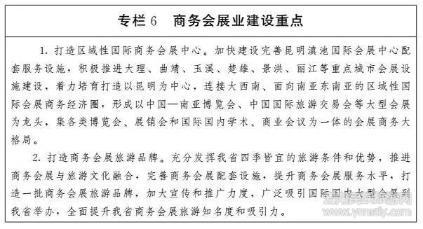 充分利用我省獨特的沿邊區(qū)位優(yōu)勢及發(fā)展商務會展的良好基礎條件,以昆明、大理、玉溪、曲靖、楚雄、景洪、麗江等重點城市為依托,加快昆明滇池國際會展中心等會展設施建設,著力辦好中國—南亞博覽會和中國國際旅游交易會,積極組織招徠大型商務會展活動,不斷提高商務會展服務水平,把我省建設成為我國面向南亞東南亞的區(qū)域性國際商務會展中心。鼓勵支持跨國集團、大企業(yè)集團以我省為總部基地,舉辦面向南亞東南亞的各類重點展會、大型會議和獎勵旅游等。充分利用全省各地文物博物館和文物藏品,舉辦情趣高雅、寓教于樂,群眾喜歡、游客慕名而來的各類文博展覽會等。積極引進國內(nèi)外知名會展企業(yè)來滇創(chuàng)辦會展企業(yè),鼓勵社會資本進入會展行業(yè),打造策劃、代理、廣告、宣傳、工程等會展全產(chǎn)業(yè)鏈產(chǎn)品,培育提升“南博會”“旅交會”“農(nóng)博會”“文博會”等一批國際商務會展品牌,不斷提高商務會展品牌價值和效益。