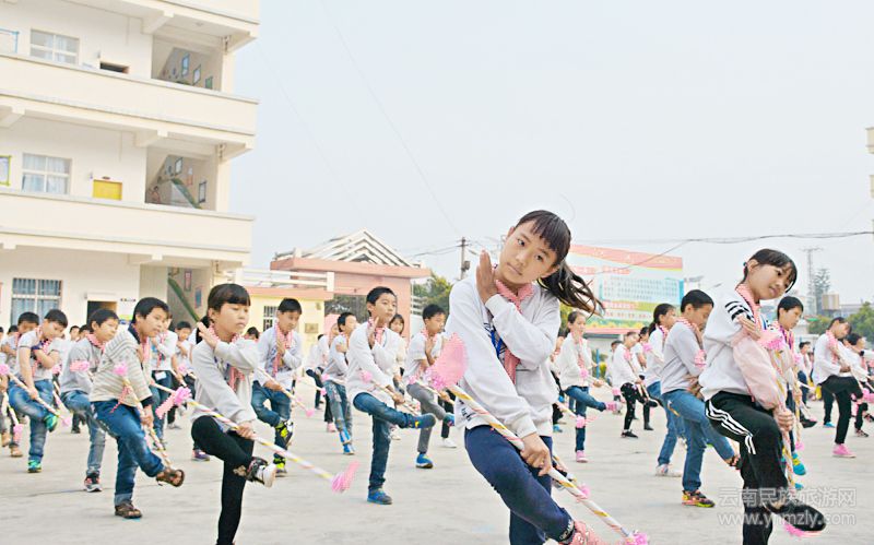 蒙自市草壩中心學(xué)校長(zhǎng)期重視挖掘,整理,傳承民族文化精髓。本學(xué)期開始,把當(dāng)?shù)貍鹘y(tǒng)的彝族霸王鞭編成課間操,在全鎮(zhèn)10所完小中推廣,目的是讓師生在健身強(qiáng)體的課間操中傳承民族文化精髓。