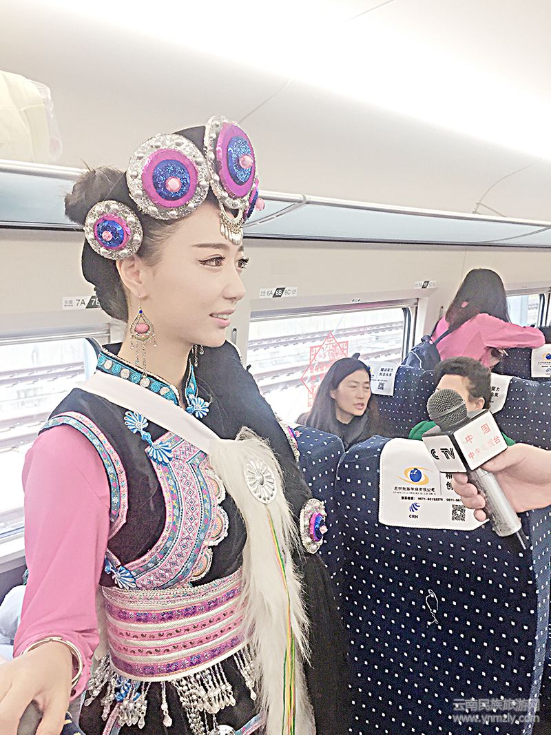 滬昆高鐵的開通是云南各族人民共同的期盼,為了見證和慶祝這具有歷史意義的時刻,2016年12月28日,云南25個世居少數(shù)民族的代表從四面八方趕往春城,在媒體云集的開通儀式現(xiàn)場,把各民族最美的風(fēng)采、最獨(dú)特的文化展示給這列時代的高速列車和來自國內(nèi)外的旅客。其中,一位來自麗江的納西族“胖金妹”在儀式上表現(xiàn)突出、引人注目,深受媒體追捧。她身著漂亮的納西族服飾,落落大方、親切自然。央視記者對她進(jìn)行重點(diǎn)采訪,新華社記者對她進(jìn)行英文采訪,鐵路傳媒現(xiàn)場直播對她的訪談。她面帶笑容侃侃而談,不僅宣傳了云南,宣傳了麗江,還在高速行駛的高鐵上書寫了獨(dú)特的東巴象形文字來表達(dá)自己的心聲。媒體、旅客和觀眾們都夸贊她不僅是“麗江的形象代言人”,也是“云南的形象代言人”。為此,記者專門對她進(jìn)行了采訪。