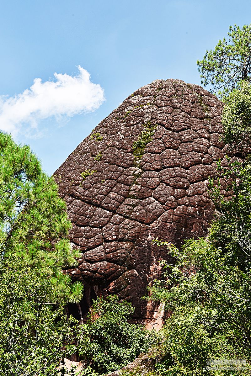 由于這里的石頭景石質(zhì)松軟、滲水力極強的紅沙石,雨水季節(jié),滿山的石頭吸足了水份,到了旱季,日曬天干,石頭內(nèi)涼外熱,綻開道道裂紋以泄氣,天長日久仿如綻放的花朵,此種景觀在景區(qū)內(nèi)比比皆是。