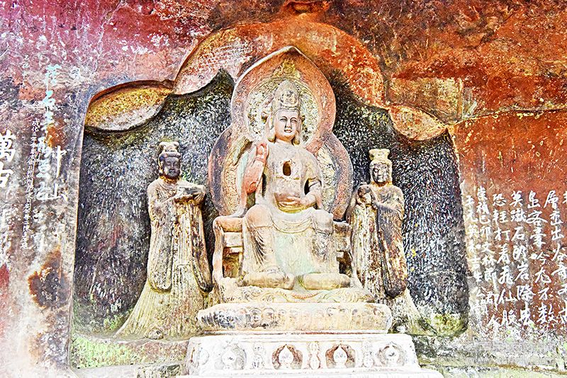 景區(qū)主要由石鐘寺、寶相寺、金頂寺、靈泉庵、海云居等組成,峰巒疊嶂,谷幽水秀。當(dāng)踏進石寶山的那一刻,仿佛置身于天然大氧吧,林禽爭鳴,山花爛漫。山中風(fēng)光,各有情趣,集山險、石奇、水秀、谷幽于一身。劍川先人的高超技藝,都淋漓盡致地體現(xiàn)在這山水一隅,令人驚嘆不已。種種美景似乎得到了大自然最好的眷顧。同去的好友便發(fā)出這樣的感嘆:“大自然太偏心了,給石寶山這么多的恩惠,這里簡直就是集聚靈氣的寶地嘛!”