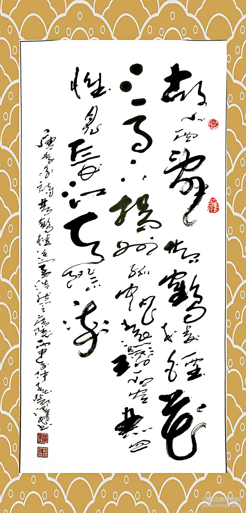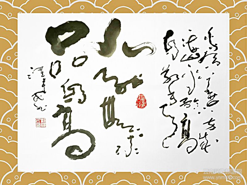 澤民先生書法,師法自然,一是從傳說中鳳鳥形象圖騰圖案畫韻及現(xiàn)代孔雀的神態(tài)揣摩鳳鳥靜立、舞蹈、翻飛、棲息、鳴唱的影子,也從美麗的振翅及有力的鳳爪、美輪美奐的身姿和流暢的彩色羽毛中尋找點(diǎn)、劃的影子;二是石啟慧根,從國脈大江畫面石及中華金沙彩風(fēng)采神韻中擷取精氣神而自成一體。癡石悟道,藏石養(yǎng)德,終有大成。澤民先生由此開創(chuàng)了被稱為“鳳體”的書風(fēng)范式。該書法特色結(jié)體奇異,線條流暢,運(yùn)轉(zhuǎn)變通,豪放自由。有鳳梳瑞羽、有鳳來儀之妙韻,蓄騰達(dá)舒展、鳳翔九天之張力。靈動流暢,牽引避讓,陰陽相諧,跌宕呼應(yīng).充沛的生命力與奔放的精神融貫于點(diǎn)、劃之中,智慧博學(xué)及豐富閱歷蘊(yùn)涵于書作之內(nèi).如龍蛇扭動盤旋于乾坤,花葉恍漾搖曳于蒼穹。在騰挪揖讓、收斂聚放中流露出豪放壯偉、深邃神奇、飄逸瀟灑和玄妙瑰麗。變幻莫測,氣勢超凡,標(biāo)新立異,成曠世孤音。人稱當(dāng)代鳳體,華夏奇葩。