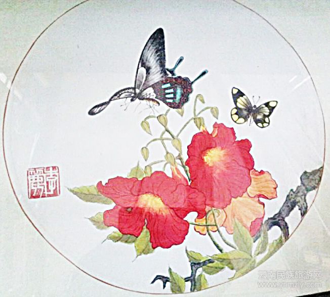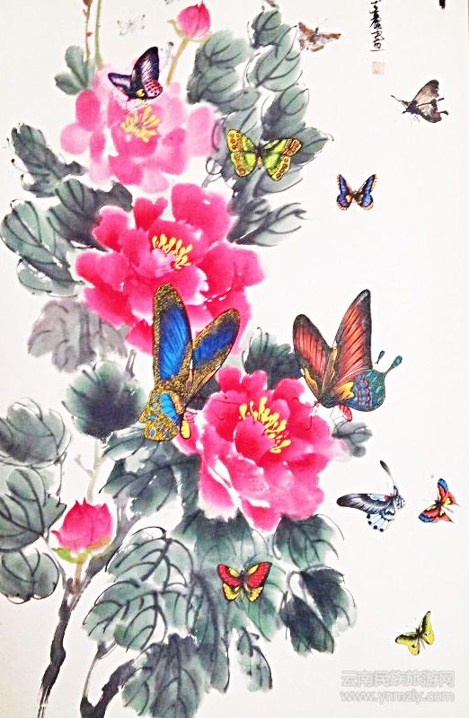 關(guān)于她的作品,前期主要以形態(tài)各異的“蝶畫(huà)”為主,其技法、技巧等造詣極高,色彩、構(gòu)思、意境等已形成獨(dú)特風(fēng)格。近幾年來(lái),開(kāi)始涉獵、挖掘東巴文化。相對(duì)來(lái)說(shuō),我比較喜歡她的東巴蝴蝶文字畫(huà)長(zhǎng)卷《原始與美麗》、東巴蝴蝶藝術(shù)畫(huà)長(zhǎng)卷《敘述》、《百圖卷》和另幾幅《花仙姑》、《大地綠了》、《情書(shū)》、《百蝶圖》、《九九歸真圖》以及四聯(lián)屏《祝福圖》等作品。長(zhǎng)卷《原始與美麗》分為四卷,每卷長(zhǎng)約6.5 米,寬約0.9 米,卷一為“風(fēng)光篇”,以東巴文的古城、云衫坪、玉龍山、虎跳峽等為基本造型,使美麗如畫(huà)、歷史悠久、小橋流水、郁郁蔥蔥、祥和美滿、鳥(niǎo)語(yǔ)花香、牛羊成群、神奇自然的麗江得到展示。卷二為“祭祀篇”,向世人展示納西人的三大祭祀活動(dòng)。卷三為“勞動(dòng)篇”,日月星辰、斗轉(zhuǎn)星移、勤勞善良的納西人種田耕地、忙“春播”,夏季烈日炎炎禾苗茁壯成長(zhǎng),納西族夫妻歡歌笑語(yǔ)“夏鋤”忙。金秋十月,碩果累累,包谷、水稻、黃豆等農(nóng)作物應(yīng)有盡有,人們歡歡樂(lè)樂(lè)忙秋收,冬天家家戶戶殺豬宰羊,燒起篝火,跳起歌莊慶祝豐……卷四為“歌舞篇”,勤勞的納西族人同音樂(lè)跳舞密不可分。世人可在畫(huà)中領(lǐng)略麗江風(fēng)土人情、人文景觀和能歌善舞的納西人。長(zhǎng)卷《百圖卷》由“百樹(shù)圖”、“百獸圖”、“百草圖”、“百鳥(niǎo)圖”四卷組成,每卷長(zhǎng)約11米、寬約1米。由東巴文的樹(shù)、草、獸、鳥(niǎo)各種形態(tài)的文字組成。長(zhǎng)卷《敘述》長(zhǎng)約34米,寬約1.2 米,從麗江的地理趨位、行政劃分到1996年大地震、冰雹等自然災(zāi)害、恢復(fù)重建、歷史文化遺產(chǎn)名城的申報(bào),以及今日的麗江,山更青、水更甜、歌更真、情更深,向世人作全面介紹。