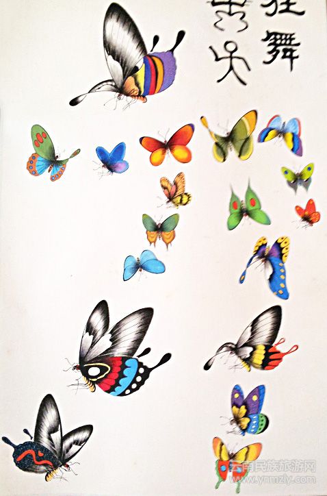 李麗通過(guò)各有特色的“蝴蝶東巴民族藝術(shù)畫(huà)”,在傾瀉胸中情懷,一吐豪氣。“蝴蝶東巴民族藝術(shù)畫(huà)”是提供她借以發(fā)揮的對(duì)象。因?yàn)樽种杏挟?huà)、畫(huà)中有字,正好具備了別的物象所不能替代的情感。人們可以在她的近作上感受到各種精神內(nèi)容,寄托豐富的情懷。無(wú)論是從造型的舒張之間、力美和節(jié)律的和諧;抑或是從造型變化、布局恰當(dāng); 還是從符號(hào)造型、概括字所具有的強(qiáng)健、敦厚、俊逸、神采于一體的特點(diǎn),都似乎是上蒼賦予人世間的尤物。畫(huà)家在經(jīng)意和不經(jīng)意間的題材求取,都能出其性靈溝通。