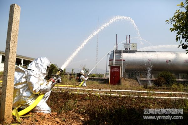 接到報警后,支隊立即啟動應急預案,并迅速調(diào)集景洪大隊、景德路執(zhí)勤點、勐養(yǎng)鎮(zhèn)政府專職消防隊40余名官兵7輛消防車,并攜帶個人防護裝備、堵漏、通信等裝備,火速趕往現(xiàn)場進行救援。到達現(xiàn)場后,指揮員立即派出一個偵察小組迅速組織偵察,并立即向指揮人員報告。指揮員在現(xiàn)場成立火場指揮部,指揮部下設災情處置組、警戒疏散組、偵檢組和技術保障組。指揮部根據(jù)現(xiàn)場力量及火場情況,調(diào)整作戰(zhàn)力量。滅火救援指揮部立即命令景洪中隊負責冷卻鄰近罐和著火罐,勐養(yǎng)政府專職消防隊出2支水槍負責南面火災,景德路消防站負責控制北面火勢,火災調(diào)查組立即協(xié)同公司人員啟動固定消防設施配合冷卻。 11時16分,“大火”被成功撲滅,指揮員迅速命令偵檢人員對空氣中的有毒氣體、風向、風速進行檢測,檢測完畢后,又命令公司義務消防員成立1個堵漏小組泄露管道進行堵漏。11時26分,險情排除,人員救出,成功堵漏,整個過程安排得井然有序,應急演練取得了圓滿成功。