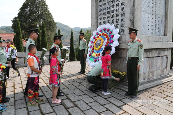蒼松翠柏襯英魂,鮮花敬獻烈士陵。下午3點30分,邊防大隊的官兵和師生們整裝列隊,在烈士紀念塔前,懷著凝重敬畏的心情,向革命烈士鞠躬,敬獻花圈,并在黨旗下一起重溫了入黨誓詞,聆聽了緝毒英雄楊軍剛烈士的先進事跡。