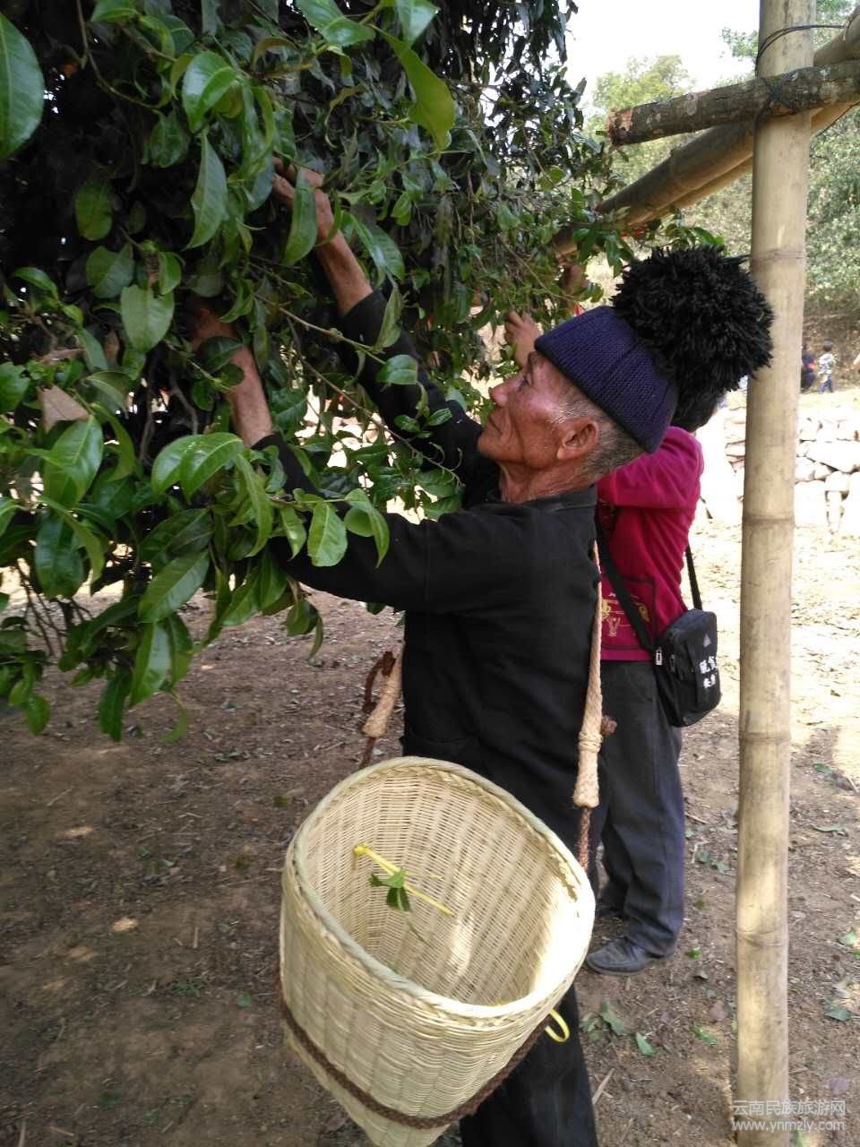 隨后,老人們和客人還用竹筒接引山泉,圍著古茶樹澆灌,這個儀式是向茶神獻(xiàn)水,期盼古茶生機(jī)勃勃,滋潤后人。在悠揚(yáng)的佤族樂曲聲中,采茶妹和采茶哥攀上高高的架子,在外圍采摘茶后的第一抹新綠,很多客人也興致勃勃地加入了采茶行列。