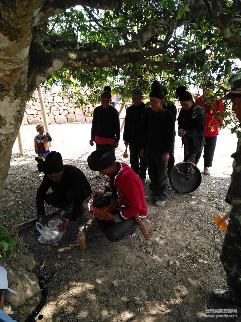 伴隨著悠揚(yáng)的民族歌曲,越來越多的民族群眾聚攏在古茶樹周圍。下午兩點(diǎn)半,茶后采摘儀式正式開始。佤族村寨里有威望的老人,開始圍著古茶樹祭拜茶神。神秘的祭拜儀式,讓遠(yuǎn)道而來的客人感受到了佤族茶文化的魅力。