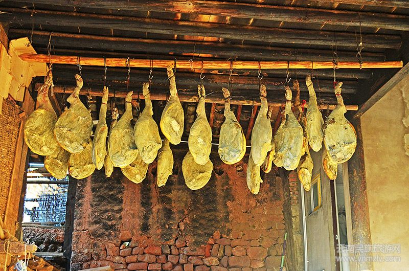 第二天踏上旅程,獨有的鄉(xiāng)村小道綠意盎然,柔和的光線輕輕穿過氤氳空氣。路邊和藹的老人微笑著點點頭,這淳樸笑容,沒有懷疑,沒有芥蒂。伴著藍天白云走進諾鄧,遠遠便看見掛在村口的火腿,它仿佛在喜迎賓客。那入眼依山而建、錯落有致的房屋讓旅者眼前一亮。走在石板路上,內(nèi)心久久不能平復,那流傳了千年的故事,正亟待著被人們揭開神秘的面紗。