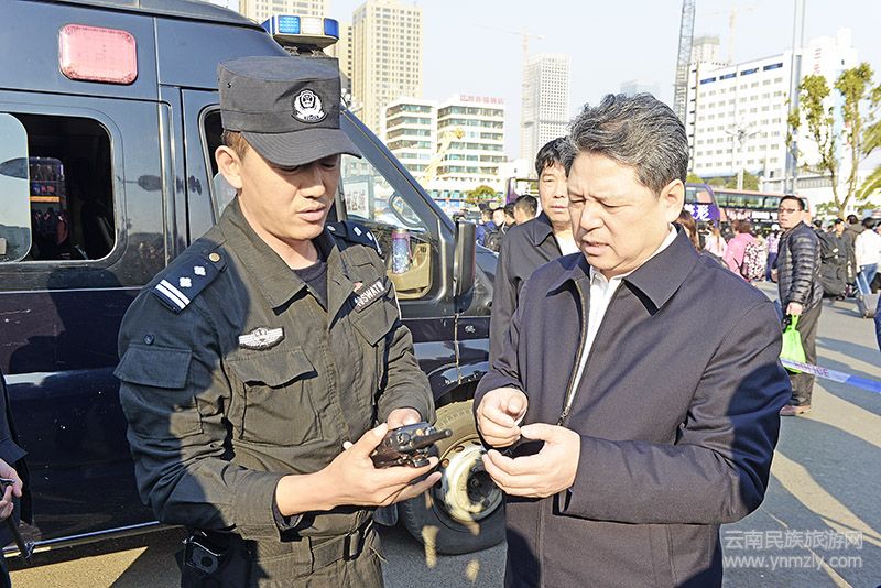 任軍號(hào)先后深入昆明火車站、南窯汽車站、北京路派出所、金碧廣場、南屏街廣場、塘子巷地鐵站、昆明市公安局指揮中心等地,首先通過現(xiàn)場撥打110報(bào)警電話檢查了聯(lián)勤聯(lián)動(dòng)指揮勤務(wù)模式運(yùn)行情況,實(shí)地察看了警力資源配置、值班備勤和在崗在位、重點(diǎn)部位安檢、警務(wù)裝備配備情況,聽取了流動(dòng)人員管理、應(yīng)急安全防范和處置警情數(shù)量、類型等情況匯報(bào),隨機(jī)檢查了工作臺(tái)賬,并在昆明市公安局指揮中心調(diào)度了全市公安執(zhí)勤情況。