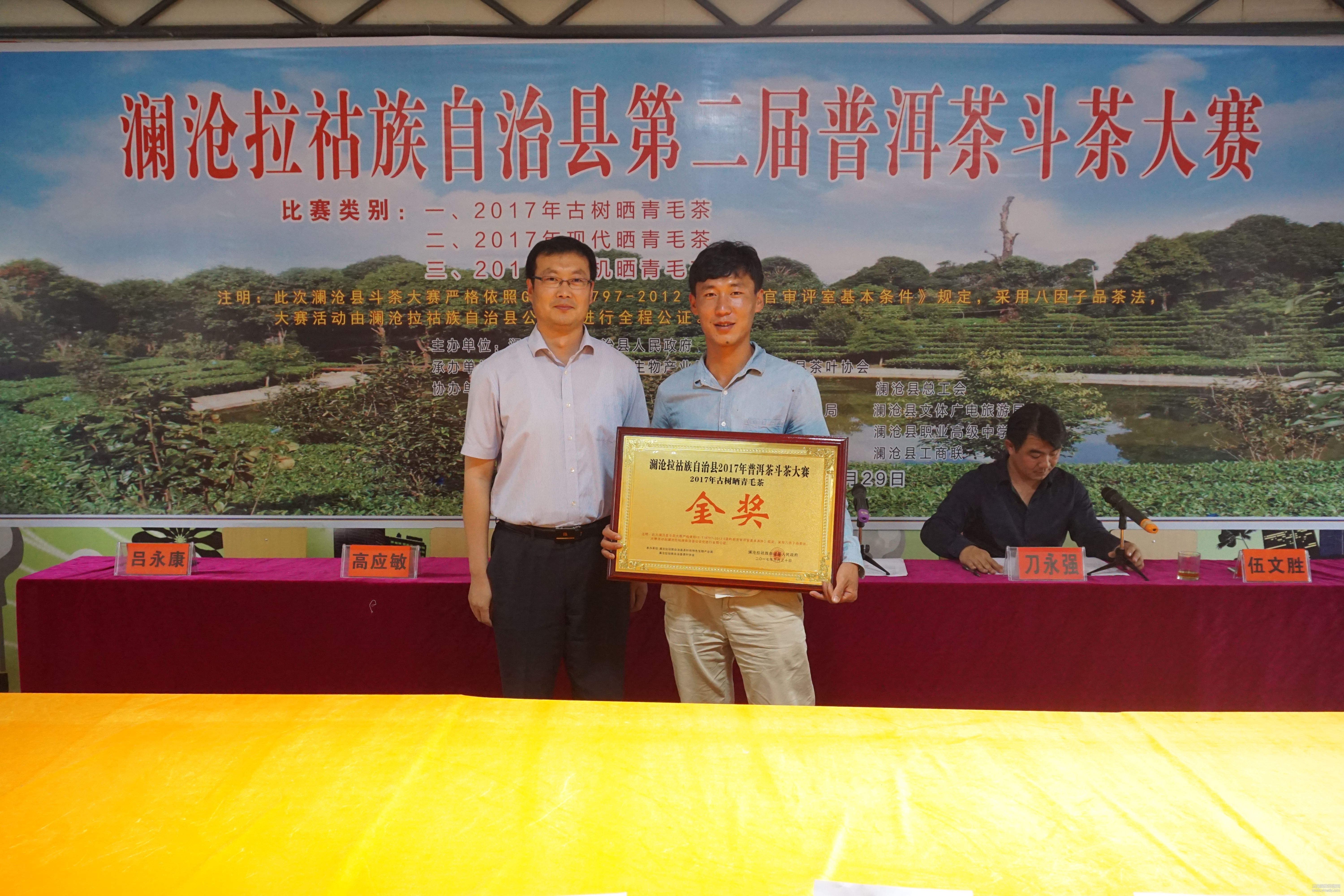 (瀾滄縣委常委、縣人民政府副縣長張文韜為古樹曬青金獎獲得者頒獎)