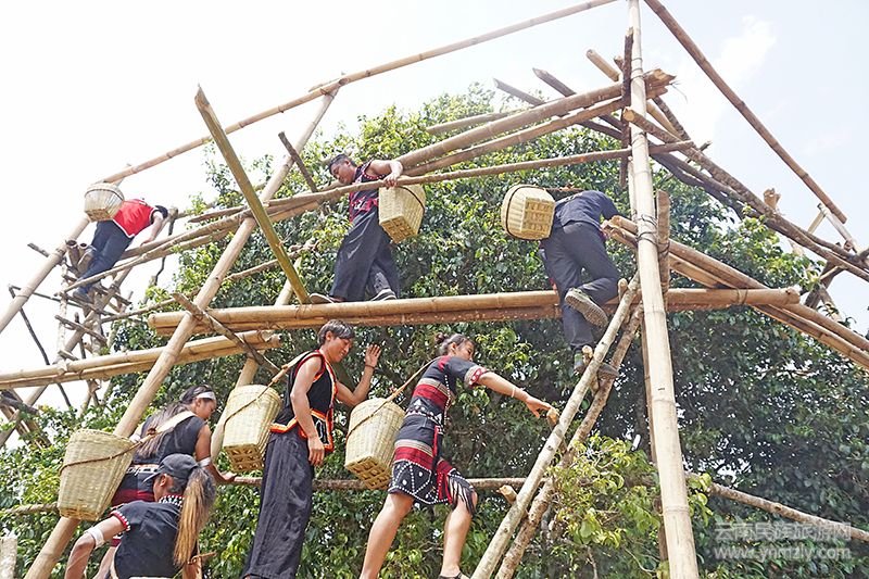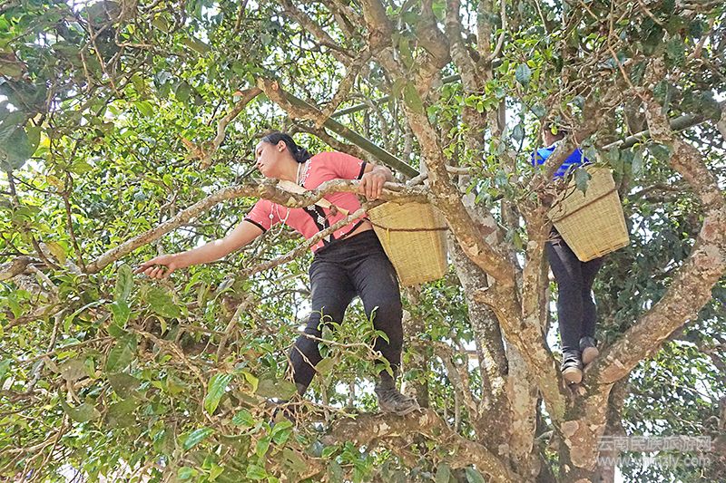隨后,老人們和客人還用竹筒接引山泉,圍著古茶樹澆灌,這個儀式是向茶神獻水,期盼古茶生機勃勃,滋潤后人。在悠揚的佤族樂曲聲中,采茶妹和采茶哥攀上高高的架子,在外圍采摘茶后的第一抹新綠,很多客人也興致勃勃地加入了采茶行列。