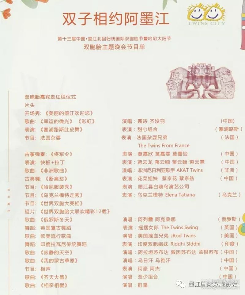 由中國(guó)共產(chǎn)黨墨江哈尼族自治縣委員會(huì)、墨江哈尼族自治縣人民政府、云南廣播電視臺(tái)主辦的中國(guó).墨江國(guó)際雙胞胎節(jié)暨哈尼太陽(yáng)節(jié)于4月30日—5月2日,在太陽(yáng)轉(zhuǎn)身的地方——墨江隆重舉行。來(lái)自俄羅斯、美國(guó)、贊比亞、烏克蘭、印度、老撾、泰國(guó)等世界各地的雙胞齊聚墨江,共享慶典。