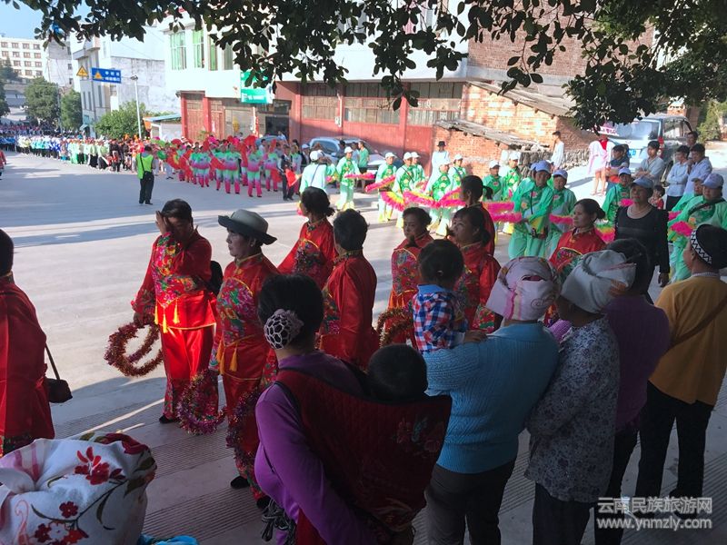 每年皇姑節(jié),南秀社區(qū)太平寨村都要組織本縣的文藝隊(duì),同時(shí)邀請(qǐng)外縣、外地州的文藝隊(duì)組成巡演長(zhǎng)龍隊(duì)伍,歡歌起舞、熱熱鬧鬧去接皇姑,今年也不例外。早上8點(diǎn),86支演出隊(duì)1400多人聚集在皇姑廟,在寨老和幾個(gè)童男童女的帶領(lǐng)下,鑼鼓聲聲,隊(duì)伍出發(fā)。