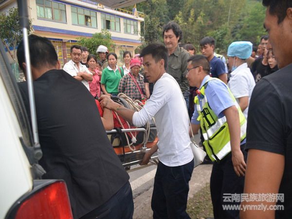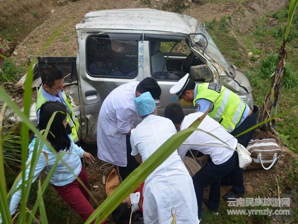 接報后,交警大隊立即組織警力迅速趕往事故現(xiàn)場,并及時聯(lián)系醫(yī)療部門前往搶救。到達(dá)事故現(xiàn)場后,民警通過對事故現(xiàn)場初步勘察,發(fā)現(xiàn)一輛輕型普通貨車停在道路下面,事故點距有效路面有80多米高,車體已嚴(yán)重變形,現(xiàn)場一片狼藉。同時途經(jīng)事發(fā)路段圍觀的車輛及群眾陸續(xù)增加,堵塞了道路。針對這一情況,民警立即對現(xiàn)場圍觀的車輛及群眾進(jìn)行安全疏散,防止交通道路堵塞,避免二次事故的發(fā)生;同時立即組織人員前往道路下?lián)尵缺焕藛T,當(dāng)民警和協(xié)管員趕到被困人員所處位置時,只看到發(fā)生事故的車輛駕駛室已嚴(yán)重變形、車門無法打開,傷員被困在車內(nèi)并不時發(fā)出痛苦的呻吟聲,其中一名被困人員已昏迷,為了盡快把傷員救出車外,為其接受治療爭取時間,民警和協(xié)管員加快了營救速度,利用簡單的工具將變形的車門撬開,及時將卡在車內(nèi)的傷員成功從車內(nèi)救出。在醫(yī)療救護(hù)人員迅速對已昏迷的人員開展了救援工作之后,民警與醫(yī)療人員齊心協(xié)力將傷員從距離公路80米遠(yuǎn)的路下,小心翼翼地抬上了在現(xiàn)場等候的救護(hù)車,并送往醫(yī)院進(jìn)行搶救。