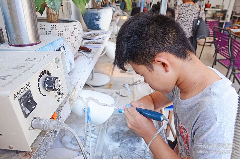 今年26歲的景頗族小伙子來馬南是德宏芒市人,這個左腿殘疾的年輕人在玉雕工作室學習玉雕已經四年了。現如今,來馬南以嫻熟的玉雕技術已成為玉雕工作室里小有成就小師傅,平日里師傅方卡華出門談生意不在工作室的時候,都是他在耐心地教其他幾位小師弟們雕刻。“來我們這里學習玉雕的大多數都是殘疾人,方師傅對每一位學員都很細心,他不止耐心的教大家怎么雕刻,還每個月給大家一些生活費、零花錢。在這里,我們就像在一個大家庭里,安心的學習、快樂的生活。雖然大家都說我是這里學得最好的徒弟,但我還是想多跟著方師傅學習幾年,把玉雕技藝在提升一些。”靦腆不多話的來馬南說起幾年來在工作室的點滴生活,臉上微微露出了笑容。