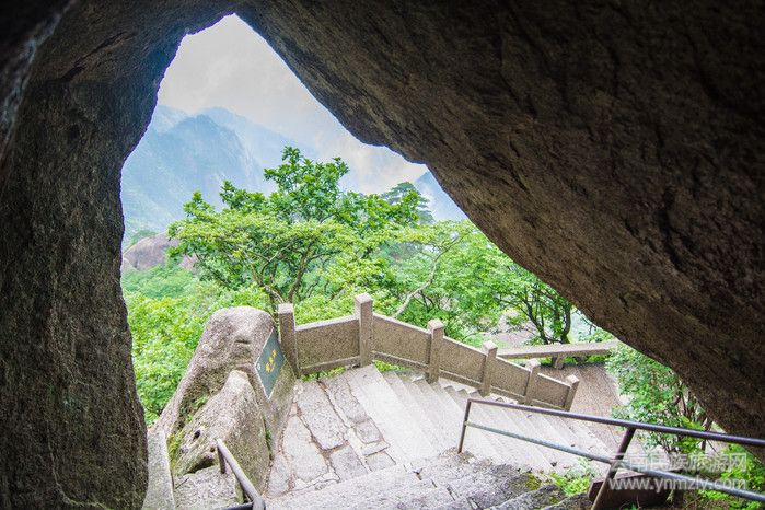 在這沒(méi)有成功的觀日出之后,就往前山方向走了,計(jì)劃是在中午的時(shí)候到山下,乘13:30的車去往宏村。路上經(jīng)過(guò)鰲魚(yú)峰(也是看日出的好地方),鰲魚(yú)洞以及百步云梯(劉曉慶當(dāng)年拍攝電影《小花》的取景點(diǎn))等景點(diǎn),一直到迎客松。