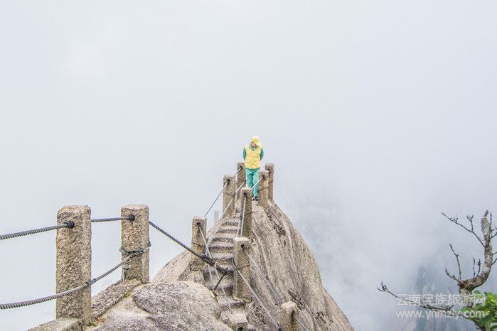 登天都峰的階梯有著超大的傾角,時(shí)常讓人手腳并用,鑿出來(lái)的石階還沒(méi)有我41碼的腳寬,幾乎所有登山的人都在邊爬邊罵!這可能就是登山的樂(lè)趣所在吧?大家心里都明白,越難爬,到達(dá)頂峰就會(huì)越自豪。爬完石階,穿過(guò)鯽魚(yú)背就算登頂了??刹灰∏屏诉@鯽魚(yú)背!此石矼長(zhǎng)10余米,寬僅1米,兩側(cè)懸崖深不可測(cè),其形頗似出沒(méi)于波濤之中的鯽魚(yú)之背,故名鯽魚(yú)背。自上而下,坡陡達(dá)85度左右,若遇風(fēng)吹云涌,仿佛山搖石動(dòng),這里站上一站可比網(wǎng)紅玻璃棧道刺激多了!反正我的腿是抖的。然而,路遇撿垃圾的大叔卻可以兩手背后,閑庭信步,在我心中真是神仙一般的存在!