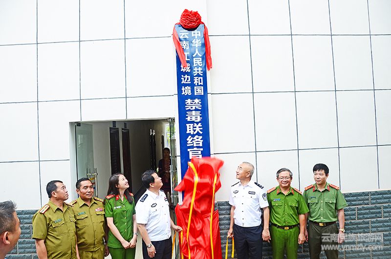 國家禁毒委員會副秘書長、公安部禁毒局副局長魏曉軍;云南省公安廳副廳長郭寶;越南公安部毒品和犯罪問題常務(wù)辦公室副主任黃英宣;老撾豐沙里省公安廳副廳長斯翁謝·維利法;普洱市副市長、市公安局局長張堯貴;江城縣副縣長、縣公安局局長謝光德;以及省公安廳、版納、紅河、臨滄等地公安機關(guān)的相關(guān)部門和民警參加了揭牌儀式。