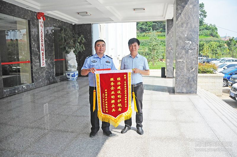 7月31日,云南鍇升礦業(yè)有限公司攜印制有“經濟建設的護航者,服務企業(yè)的排頭兵”字樣的錦旗和一封感謝信來到馬關縣公安局治安大隊,對該大隊踐行落實“放管服”系列改革,為企業(yè)排優(yōu)解難、提效益、促發(fā)展表示感謝。