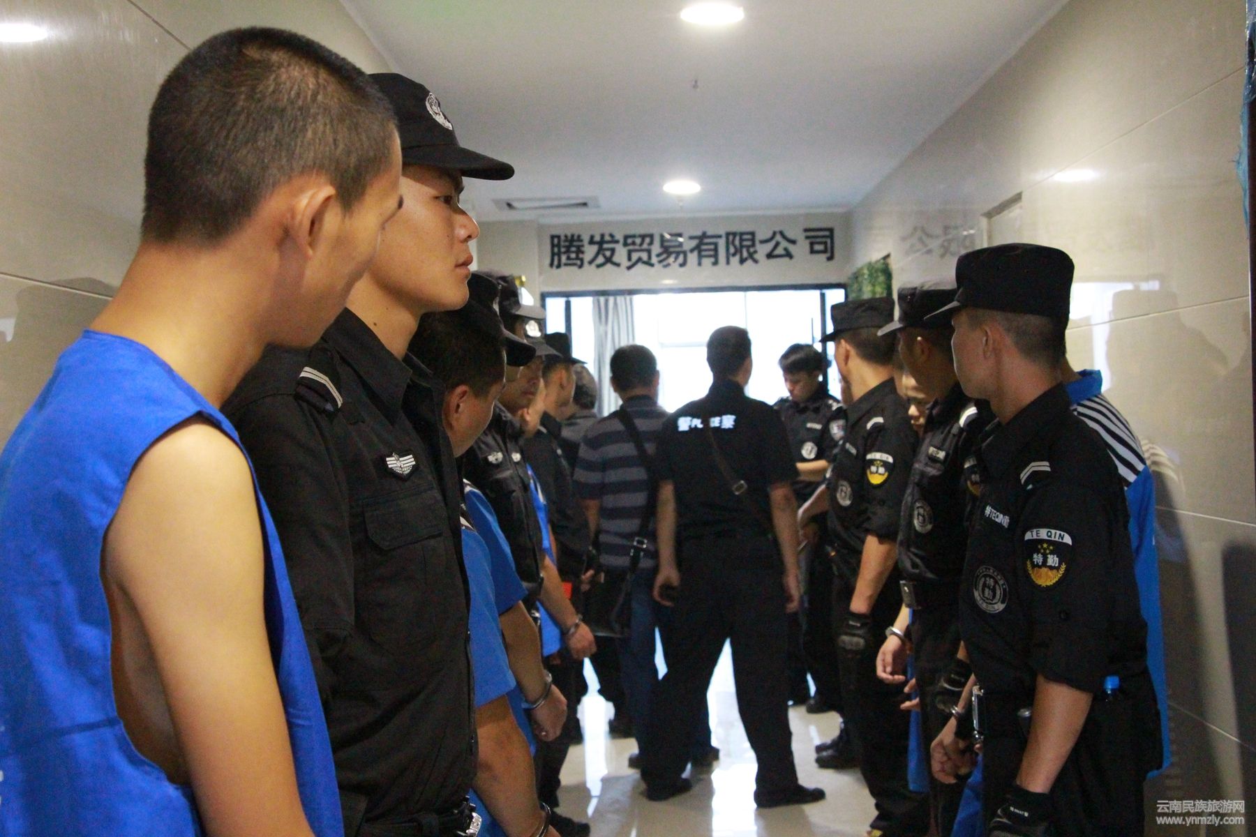 掌握相關(guān)證據(jù)和犯罪團伙活動規(guī)律后,專案組經(jīng)過周密部署,文山州、市公安局組織60余名警力分兩組,決定于7月13日22時對騰發(fā)貿(mào)易有限公司進行突襲。21時30,第一組警力通過電梯順利到達預(yù)定位置,第二組警力由寫字樓物管人員帶領(lǐng)步行走應(yīng)急通道。突發(fā)狀況卻在這時出現(xiàn),由于寫字樓物管工作人員交接問題,原先勘查好的通道防火門被鎖,緊張的物管工作人員又多次帶領(lǐng)走錯方向。眼看時間一分一秒流逝,如不能按計劃展開行動,讓犯罪團伙有所察覺銷毀證據(jù),那等于打了一場敗仗!作為現(xiàn)場總指揮,文山市公安局副局長王莊明臨時調(diào)整,帶領(lǐng)第二組警力走電梯通道,終于趕在22時前到達隨即突入騰發(fā)貿(mào)易有限公司。