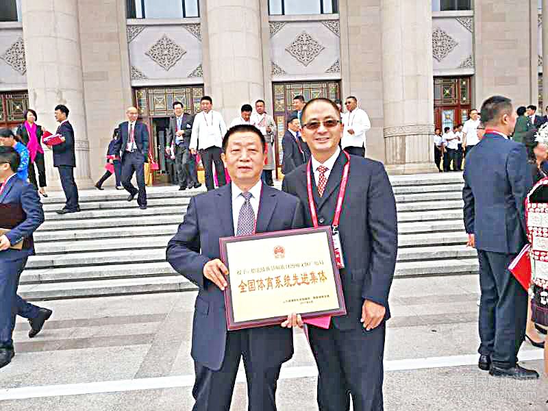 28日上午,老天給力,下雨天突然轉(zhuǎn)晴,天津美麗如畫。8時(shí)30分,全體代表經(jīng)過嚴(yán)格安檢,從下榻在不同方向的賓館匯聚到天津禮堂。天津禮堂彩旗飄揚(yáng),熱鬧非凡。9時(shí)40分,1300余名參會代表在工作人員的引領(lǐng)下整裝待會。會場布置的簡潔明了,主席臺正上方一條顯眼的紅布標(biāo)寫明了會議主題。安靜有序的會場上不時(shí)有相熟的人小聲交談,更有人按捺不住激動,借候會之閑合影留念。我因與同行的云南代表團(tuán)分開坐,急忙發(fā)信息給同在會場的德宏老體協(xié)常務(wù)副主席楊旻“想著幫我照現(xiàn)場領(lǐng)獎的像”,結(jié)果會后一看,禮堂屏蔽發(fā)不出信息。10時(shí),表彰大會正式開始。我與代表全國體育系統(tǒng)先進(jìn)集體的同志一道,身著西裝,踏著樂點(diǎn),邁著正步,精神抖擻的走上主席臺。為我頒牌的是國家體育總局副局長李穎川,他2016年8月來德宏檢查指導(dǎo)過工作。他握著我的手叮囑:“不錯,好好干!”端著由國家人力資源社會保障部和國家體育總局頒發(fā)的獎牌,接受各路記者的照相,內(nèi)心的激動流于言表,真的,我由衷的為云南驕傲,為德宏驕傲。