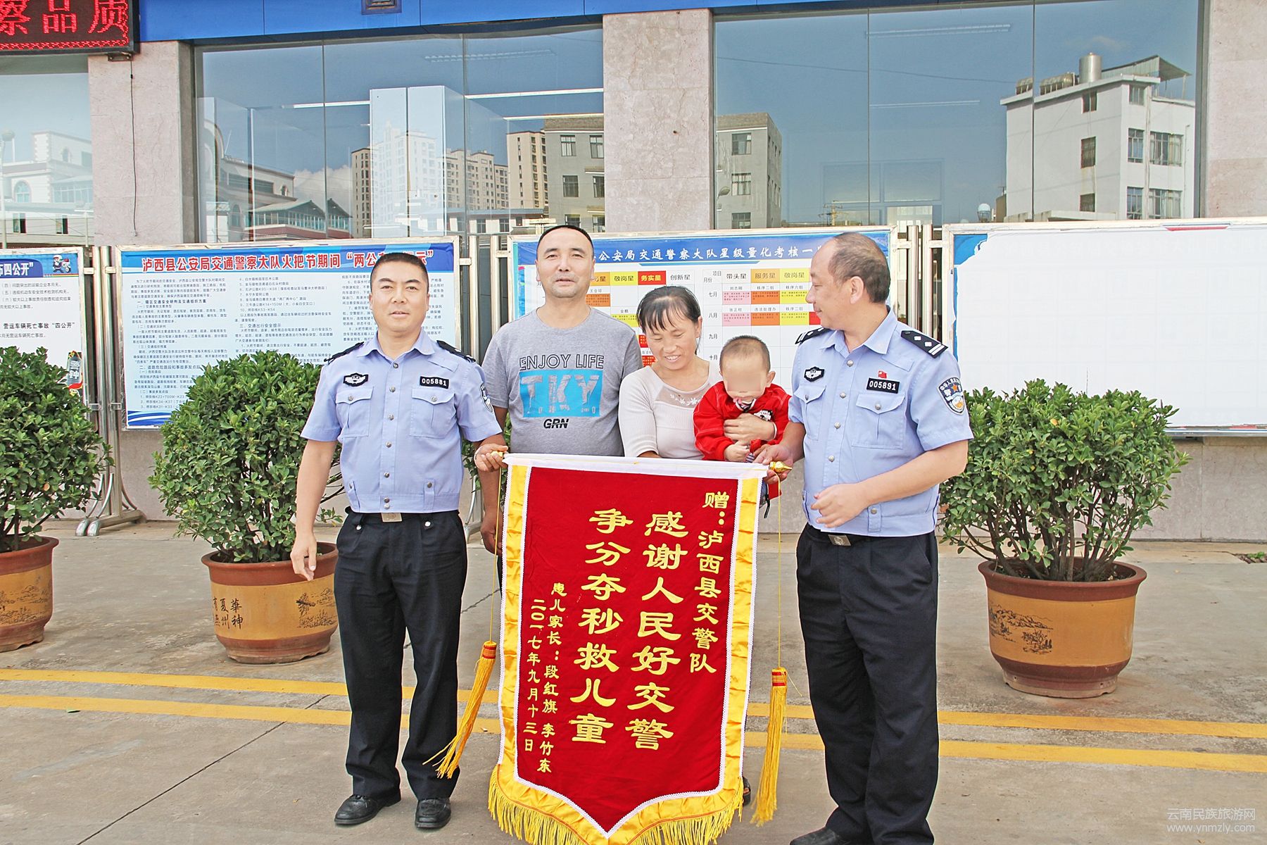9月25日下午,瀘西縣段某將一面印有“感謝人民好交警,爭分奪秒救兒童”的錦旗送到瀘西縣公安局交警大隊,表示對瀘西交警的感激之情。
