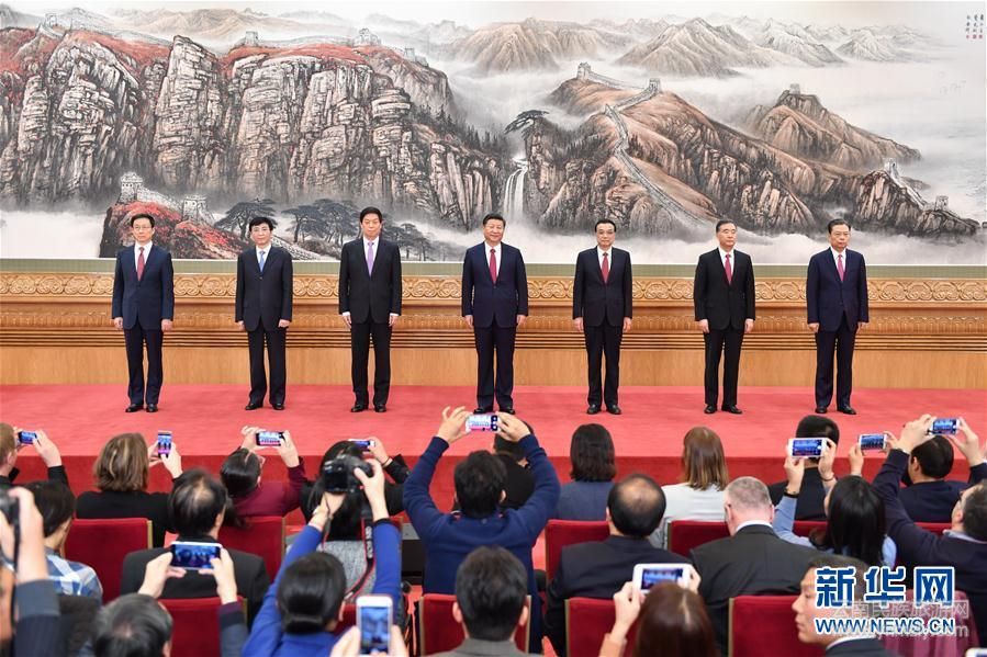 10月25日,剛剛在中共十九屆一中全會上當(dāng)選的中共中央總書記習(xí)近平和中央政治局常委李克強、栗戰(zhàn)書、汪洋、王滬寧、趙樂際、韓正在北京人民大會堂同采訪十九大的中外記者見面。新華社記者 馬占成 攝