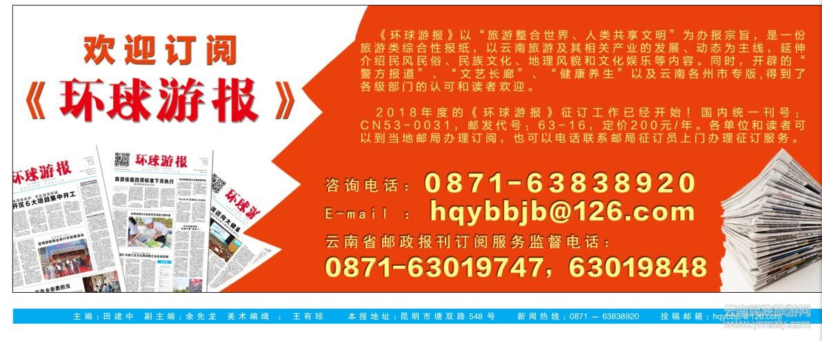 2018年度的《環(huán)球游報》征訂工作已經(jīng)開始!國內(nèi)統(tǒng)一刊號:CN53—0031,郵發(fā)代號:63---16。各單位和讀者可以到當?shù)剜]局辦理訂閱,也可以電話聯(lián)系郵局征訂員上門辦理征訂服務(wù)。