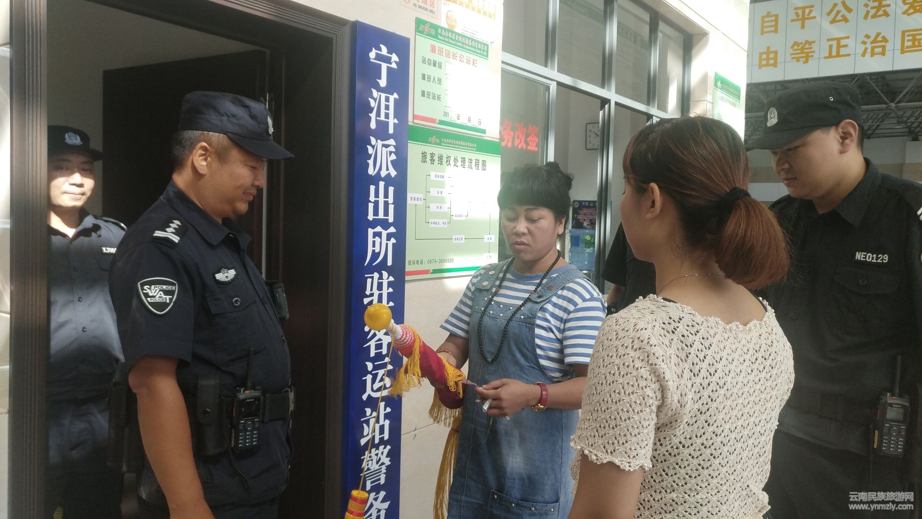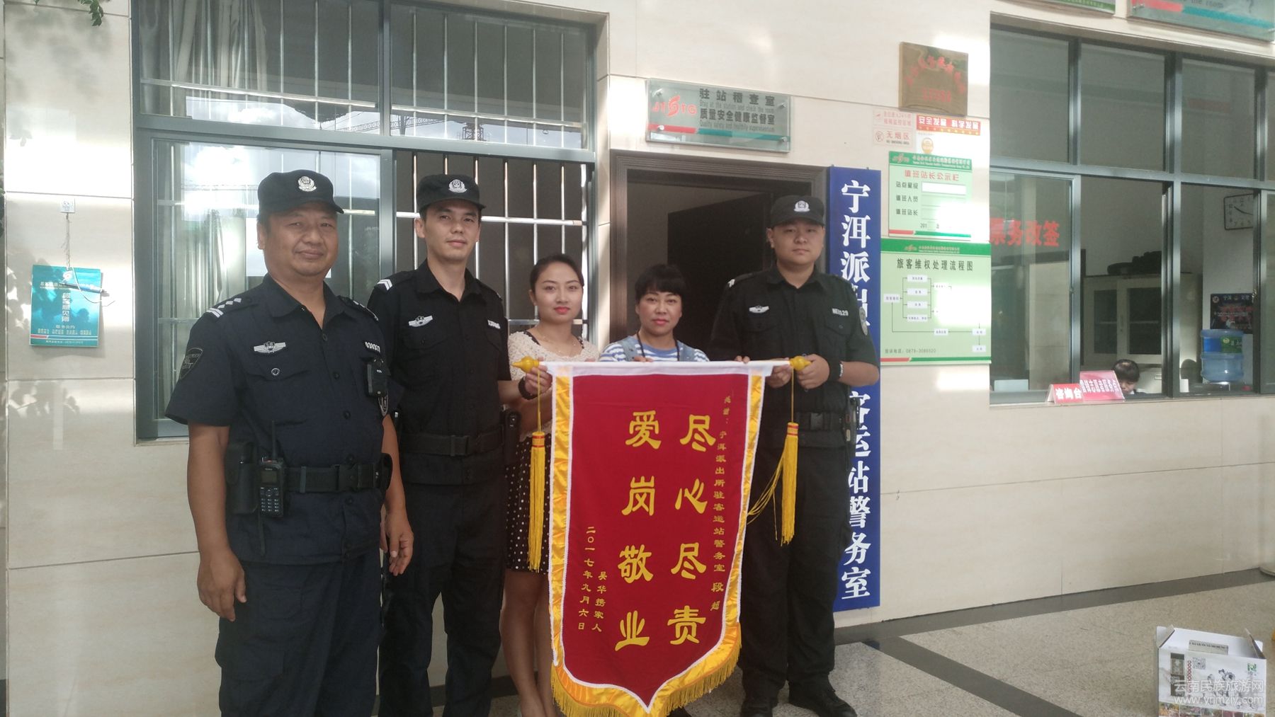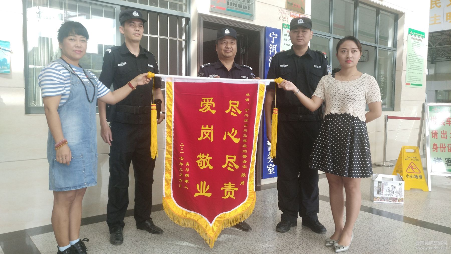 9月28日,尚女士與同伴一起走進(jìn)寧洱汽車客運(yùn)站警務(wù)室,將一面繡著“盡心盡責(zé) 愛崗敬業(yè)”的錦旗送給警務(wù)室民警協(xié)警手中,對警務(wù)室協(xié)警段超給予的幫助表示衷心的感謝。