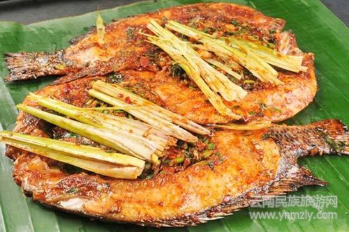 將蔥、姜、蒜、青辣椒、芫荽等佐料切細(xì),放進(jìn)魚肚子里,用二三根香茅草葉捆好,用竹片夾緊,放在火炭上烘烤,具有香、酥、鮮的特點(diǎn),是地道的傣家美食。
