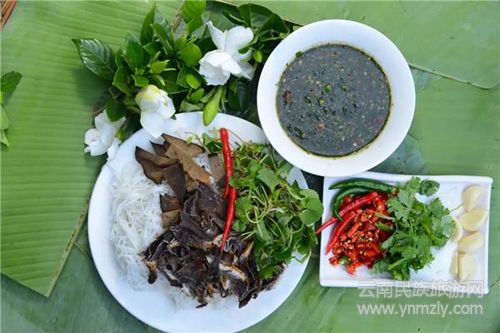 生要生得鮮嫩,因?yàn)榇鲎迦司幼〉牡貐^(qū)大多天氣炎熱,這也造成了傣家人喜食生菜的飲食習(xí)慣,包菜、生菜、胡蘿卜、黃瓜等配上傣家人自制的喃咪(蘸水),絕對(duì)是餐桌上最受歡迎的菜品之一。