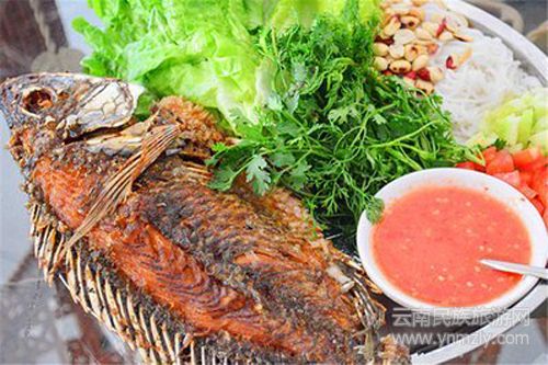 菜包魚,顧名思義就是用菜葉包著魚一起吃。用新鮮的生菜包裹著米線和油炸到酥脆的羅非魚,有的還有花生米、胡蘿卜絲等,再配上獨(dú)有的酸辣蘸水或者花生末蘸水。一口咬下去,沾汁的酸爽、魚肉的香甜加上生菜的脆,味道實(shí)在是妙不可言。