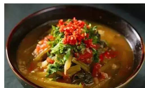 用番茄、酸木瓜片、檸檬等來調(diào)和苦味稍重的青菜,用肉湯熬煮一段時(shí)間,有湯有菜,酸辣開胃、特別下飯。