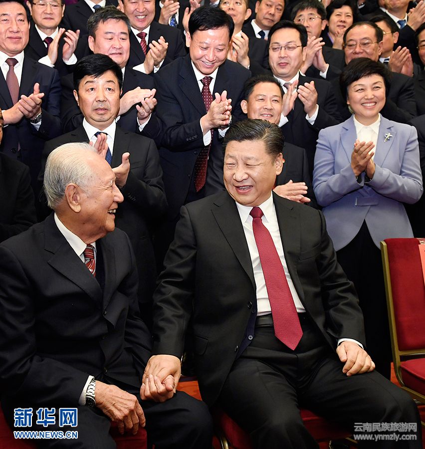 習(xí)近平總書記拉著他們的手,請兩位老人坐到自己身旁來,兩人執(zhí)意推辭,習(xí)近平一再邀請,說:“來!擠擠就行了,就這樣。”