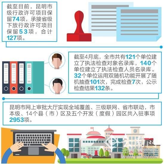 深化“放管服”改革中,昆明市積極落實(shí)承接省政府下放的行政審批事項(xiàng),開(kāi)展非行政許可和第一批、第二批國(guó)務(wù)院要求地方取消中央指定實(shí)施的行政審批事項(xiàng)清理取消工作,深入推動(dòng)簡(jiǎn)政放權(quán),開(kāi)展政府部門(mén)行政職權(quán)清理,全面建立政府權(quán)責(zé)清單制度,市政府35個(gè)工作部門(mén)和4個(gè)政府直屬事業(yè)單位共梳理出行政職權(quán)6829項(xiàng),責(zé)任事項(xiàng)5.7萬(wàn)余項(xiàng)。全面建立市縣鄉(xiāng)三級(jí)政府權(quán)責(zé)清單制度體系。截至目前,昆明市級(jí)行政許可項(xiàng)目保留74項(xiàng),承接省級(jí)下放行政許可項(xiàng)目保留53項(xiàng),合計(jì)127項(xiàng),企業(yè)和群眾辦事手續(xù)進(jìn)一步簡(jiǎn)化,創(chuàng)業(yè)準(zhǔn)入的制度性成本進(jìn)一步降低,政府權(quán)力做“減法”,換來(lái)市場(chǎng)和社會(huì)活力的“乘法”。