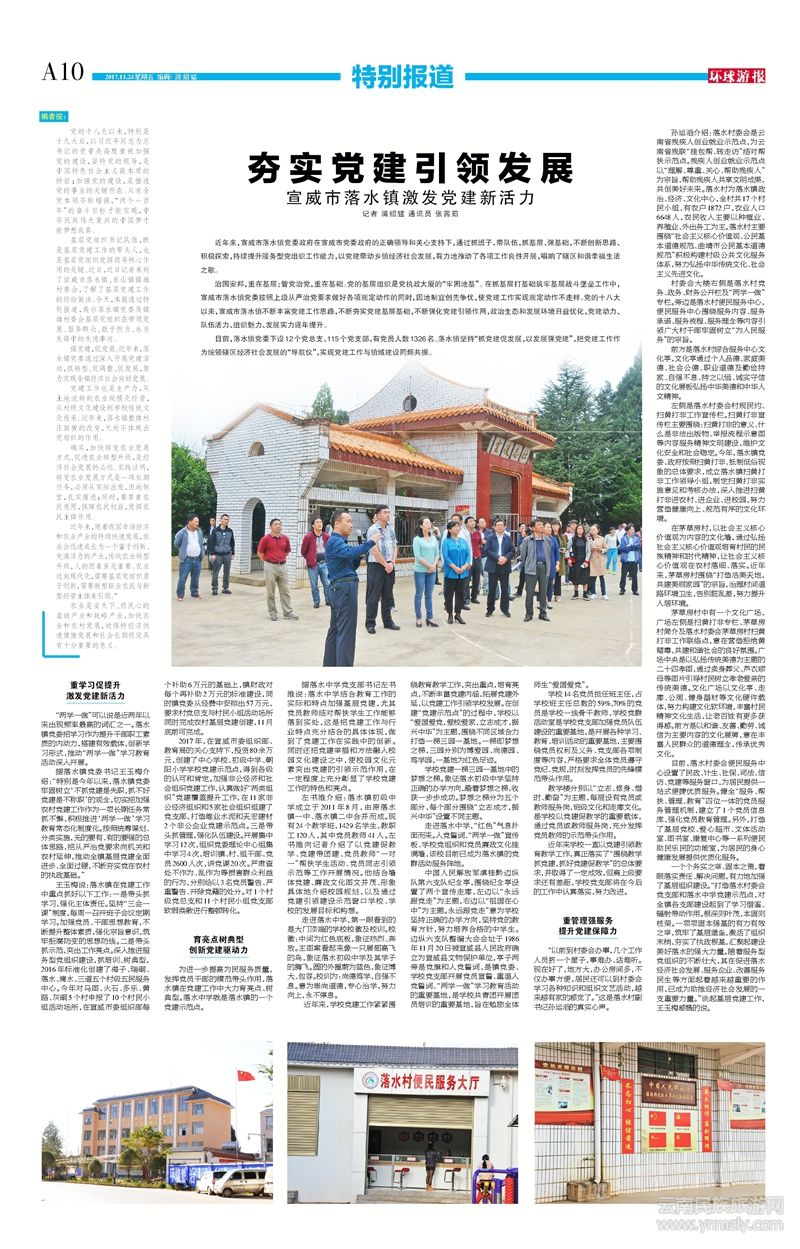 基層黨組織書記隊伍,既是基層黨建工作的帶頭人,也是基層黨組織發(fā)揮領(lǐng)導(dǎo)核心作用的關(guān)鍵。近日,近日記者來到了宣威市落水鎮(zhèn)、東山鎮(zhèn)鎮(zhèn)雄村委會,了解了基層黨建工作的經(jīng)驗做法。今天,本報通過特別報道,展示落水鎮(zhèn)黨委及鎮(zhèn)雄村委會基層黨組織在帶領(lǐng)發(fā)展、服務(wù)群眾、敢于擔(dān)當(dāng)、永當(dāng)先鋒中的先進事跡。