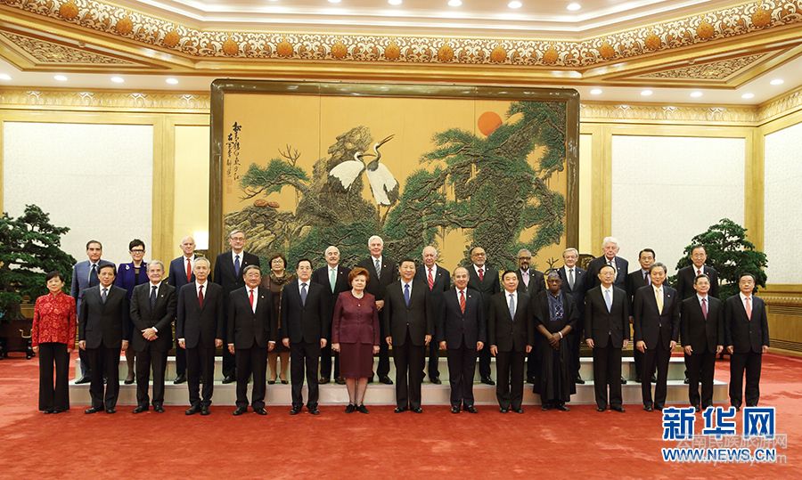 11月30日,國家主席習(xí)近平在北京人民大會堂會見來華出席“2017從都國際論壇”的世界領(lǐng)袖聯(lián)盟成員。這是會見前,習(xí)近平同外方嘉賓集體合影。新華社記者 姚大偉 攝