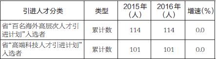 2016年省“百名海外高層次人才引進(jìn)計(jì)劃”入選者累計(jì)114人,省“高端科技人才引進(jìn)計(jì)劃”入選者累計(jì)101人,全年來(lái)滇工作的外國(guó)專家1087人,來(lái)滇掛職干部231人,安置回國(guó)留學(xué)人員14人。具體如表2所示。