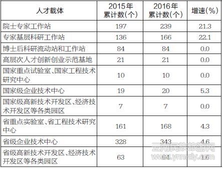 表3 2016年云南省各人才載體人才數(shù)量及其環(huán)比增長(zhǎng)速度