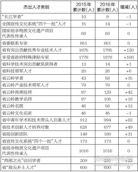 2016年全省共有“兩院”院士8人,國(guó)家“千人計(jì)劃”入選者26人,國(guó)家“萬(wàn)人計(jì)劃”入選者35人,全國(guó)杰出專業(yè)技術(shù)人才6人,新世紀(jì)“百千萬(wàn)人才工程”國(guó)家級(jí)人選68人,國(guó)家級(jí)有突出貢獻(xiàn)中青年專家63人,享受國(guó)務(wù)院政府特殊津貼人員1666人,“長(zhǎng)江學(xué)者”9人,全國(guó)宣傳文化系統(tǒng)“四個(gè)一批”人才14人,國(guó)家級(jí)非物質(zhì)文化遺產(chǎn)項(xiàng)目代表性傳承人69人,省委聯(lián)系專家651人,省有突出貢獻(xiàn)中青年專家1795人,享受省政府特殊津貼人員1878人,省科學(xué)技術(shù)突出貢獻(xiàn)獎(jiǎng)獲得者14人,省科技領(lǐng)軍人才26人,省云嶺學(xué)者58人,省云嶺產(chǎn)業(yè)技術(shù)領(lǐng)軍人才79人,省云嶺首席技師129人,省云嶺教學(xué)名師105人,省云嶺名醫(yī)58人,省云嶺文化名家45人,省中青年學(xué)術(shù)和技術(shù)帶頭人后備人才994人,省技術(shù)創(chuàng)新人才培養(yǎng)對(duì)象677人,省級(jí)創(chuàng)新團(tuán)隊(duì)180個(gè),省宣傳文化系統(tǒng)“四個(gè)一批”人才173人,省級(jí)非物質(zhì)文化遺產(chǎn)項(xiàng)目代表性傳承人1016人,“西部之光”訪問(wèn)學(xué)者231人,省“拔尖鄉(xiāng)土人才”600人。如表1所示。