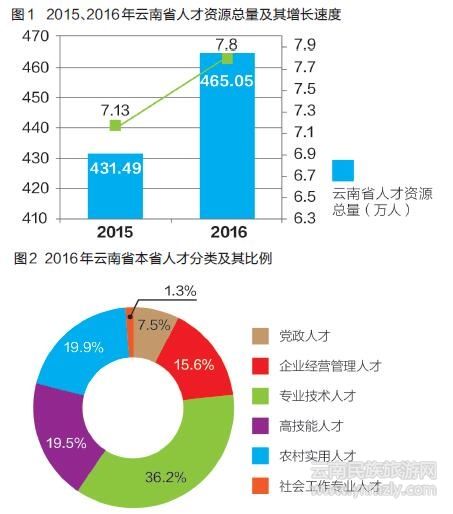 2016年全省人才資源總量465.05萬(wàn)人,比上年增長(zhǎng)7.8%;其中:中央駐滇單位人才共30.44萬(wàn)人,本省人才434.61萬(wàn)人。中央駐滇機(jī)關(guān)黨政人才總數(shù)1.72萬(wàn)人,中央駐滇企事業(yè)單位人才總數(shù)28.72萬(wàn)人。本省人才中,黨政人才32.5萬(wàn)人,企業(yè)經(jīng)營(yíng)管理人才67.86萬(wàn)人,專業(yè)技術(shù)人才157.30萬(wàn)人,高技能人才84.94萬(wàn)人,農(nóng)村實(shí)用人才86.42萬(wàn)人,社會(huì)工作專業(yè)人才5.58萬(wàn)人。如圖1、圖2所示。