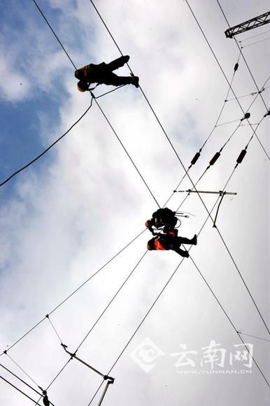 施工人員架接接觸網(wǎng)。 張偉明攝