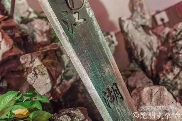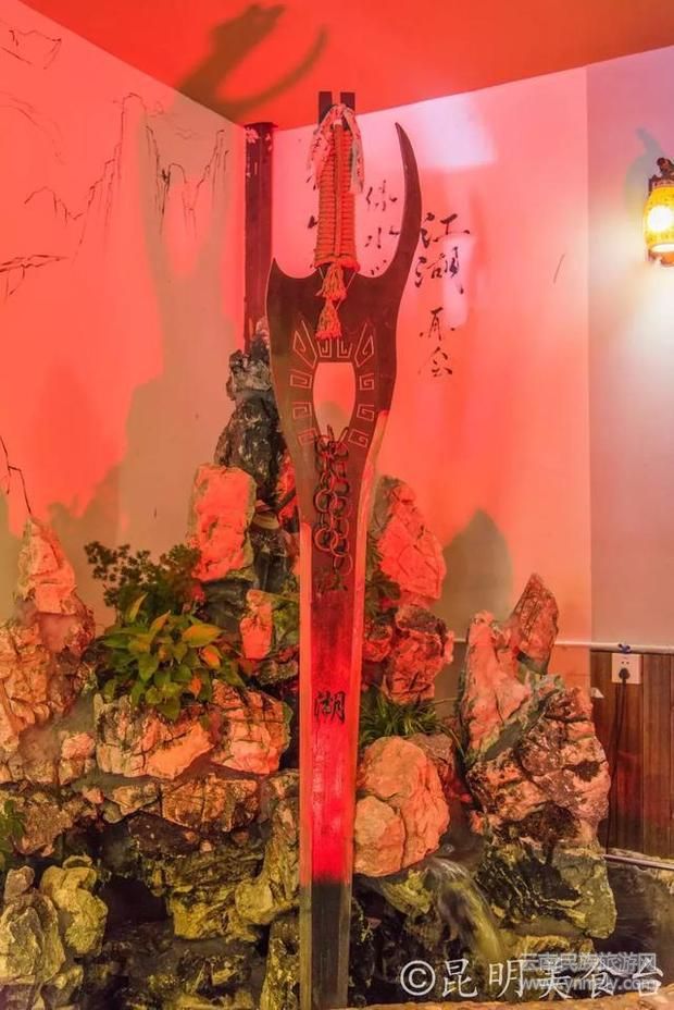 在昆明船房社區(qū)里有一家相當有江湖風(fēng)的火鍋店,里面豎立重200斤高3米的絕世寶劍,鑲嵌在石雕上,屹立不動,忽熱忽冷,散發(fā)著神奇的光芒。